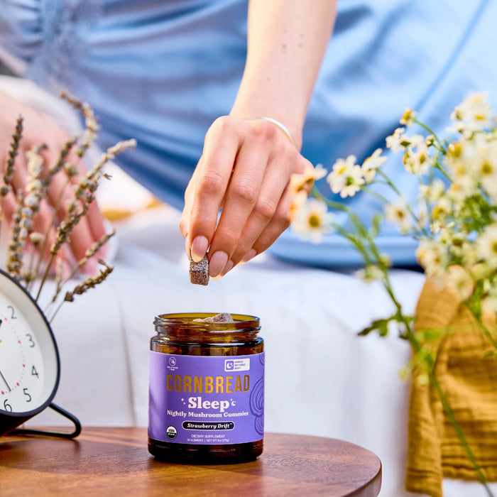 Organic Blue Agave, Organic Cane Sugar, Distilled Water, Organic Herbal Sleep Blend (chamomile Extract, Lavender Extract, Valerian Root Extract), Pectin, Organic Reishi Mushroom Extract, Organic Carnauba Wax, Organic L-Theanine (Derived from Green Tea), Organic Citric Acid, Organic Strawberry Flavor, Organic Butterfly Pea Powder, Organic Lavender Flower, Organic Chamomile Flower, Sodium Lactate.